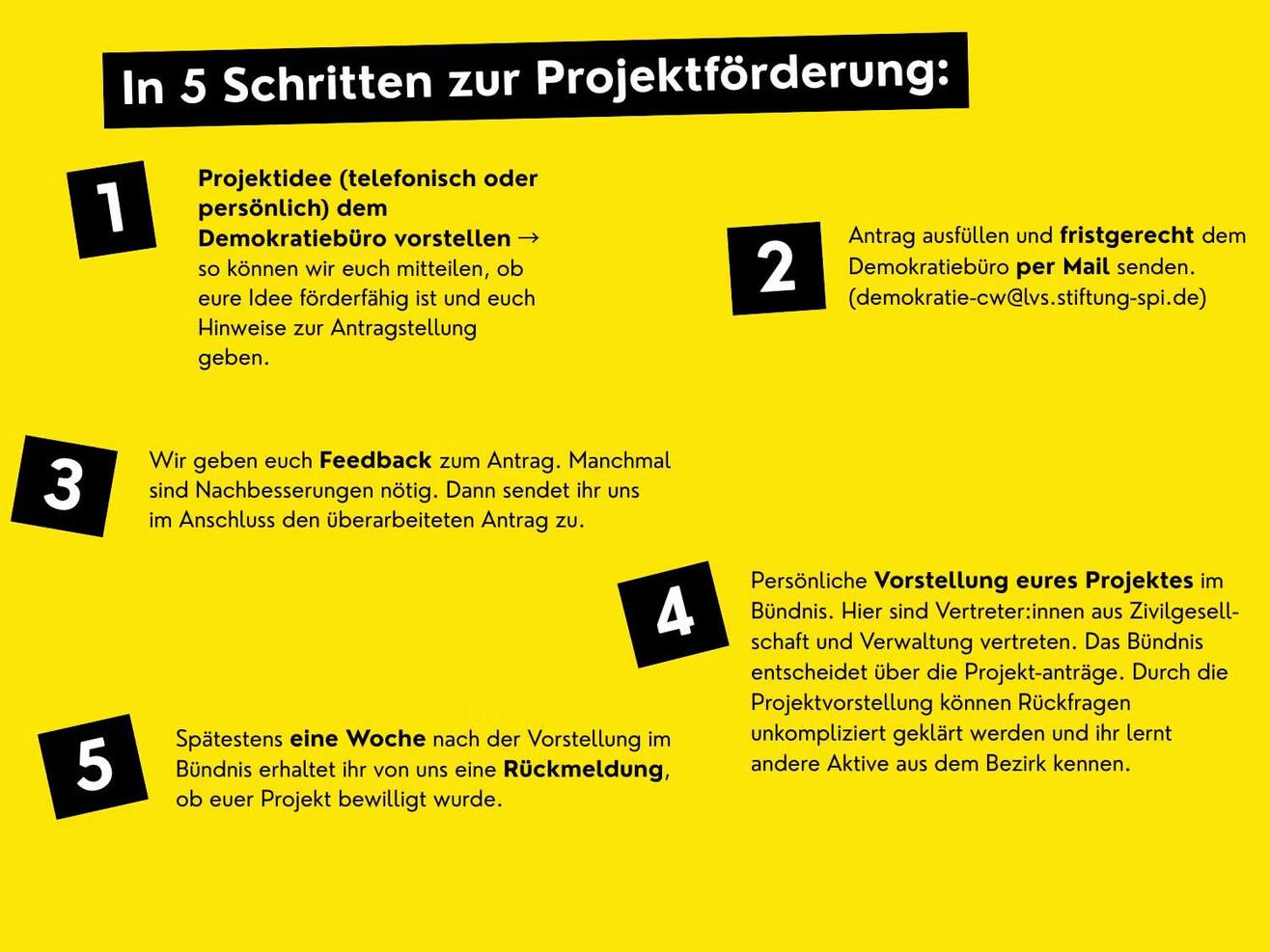 Anträge können ausschließlich gemeinnützige Träger und Organisationen stellen. Vor der Antragstellung ist ein verpflichtendes Beratungsgespräch mit dem Demokratiebüro zu führen – Anträge ohne vorherige Beratung werden nicht berücksichtigt.